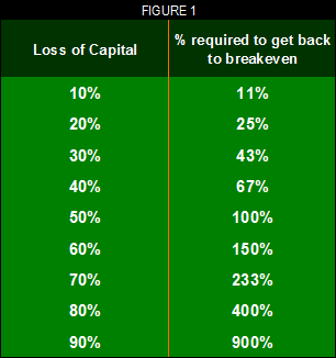 Here’s an example to drive home the absolute importance of money management. If you start with an account of USD10,000, you would have USD5,000 left if you blew off 50 per cent of your account. The real question is how much you would have to make in order to bring your account back to the break-even level of USD10,000.